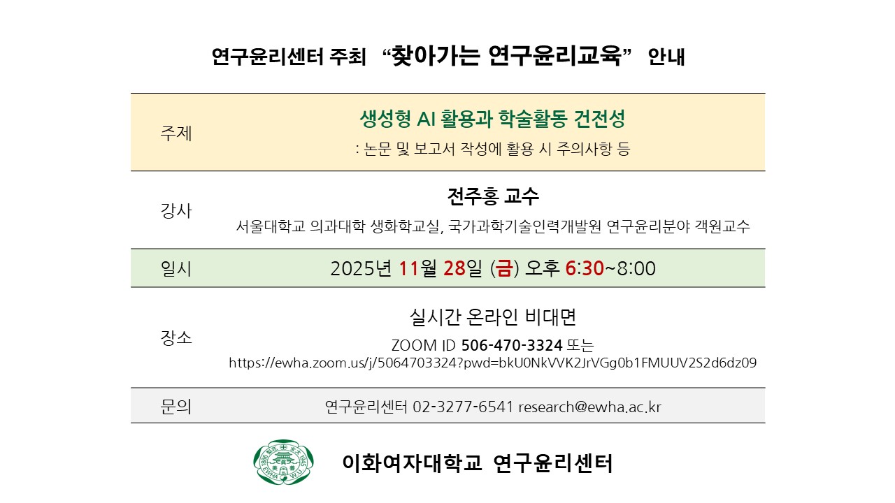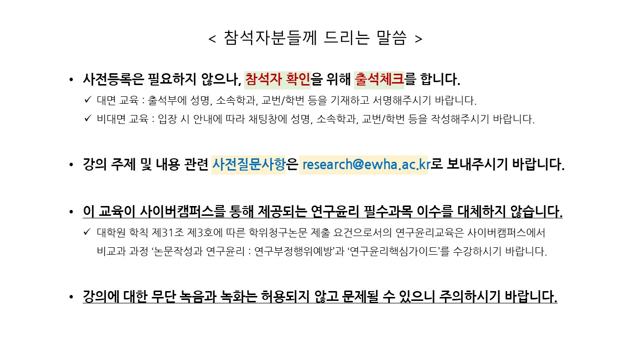 문의: 연구윤리센터 02-3277-6541 / research@ewha.ac.kr