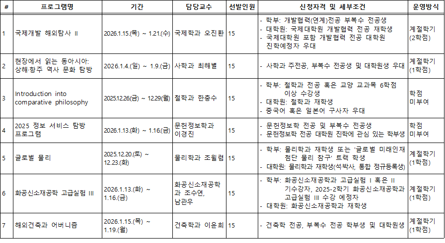 - 2025 겨울 방학 교수인솔 해외학습 프로그램은 2025-2학기 장학금으로 지급