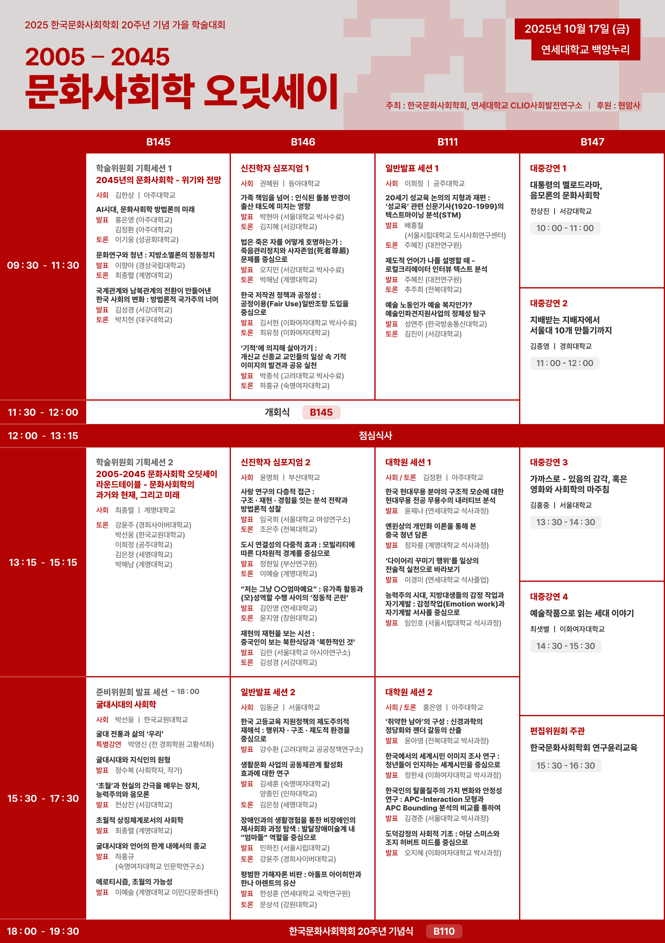 2025년 한국문화사회학회 가을 학술대회는 창립 20주년을 기념하며 <2005-2045 문화사회학 오딧세이>라는 대주제로 기획되었습니다.